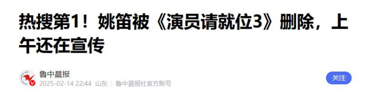 热搜第1!姚笛被《演员请就位3》删除,上午还在宣传——鲁中晨报